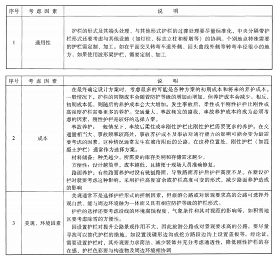 波形護欄新行業標準《JTG/T D81-2017》選取護欄形式所要考慮的因素,具體如下表: